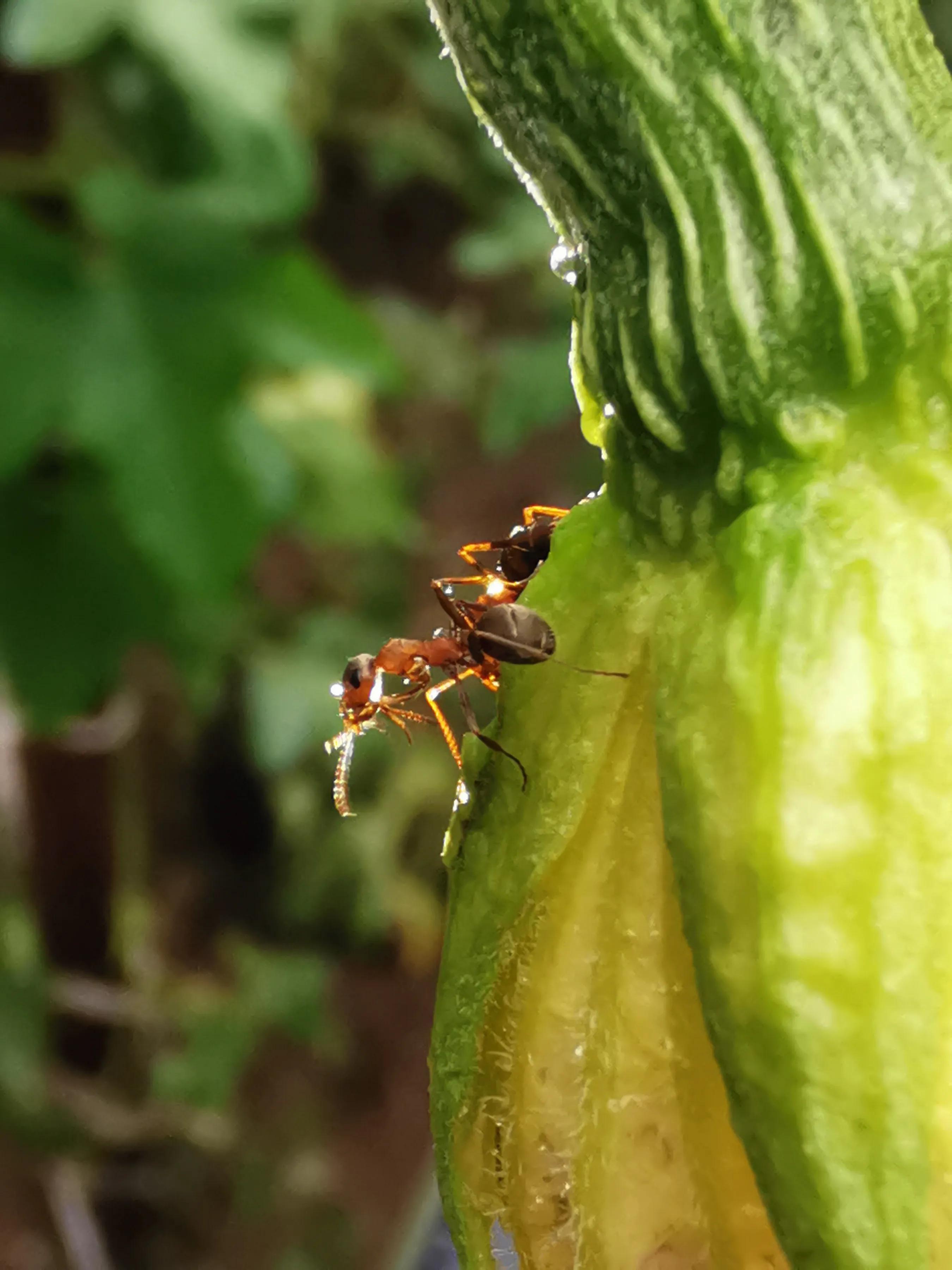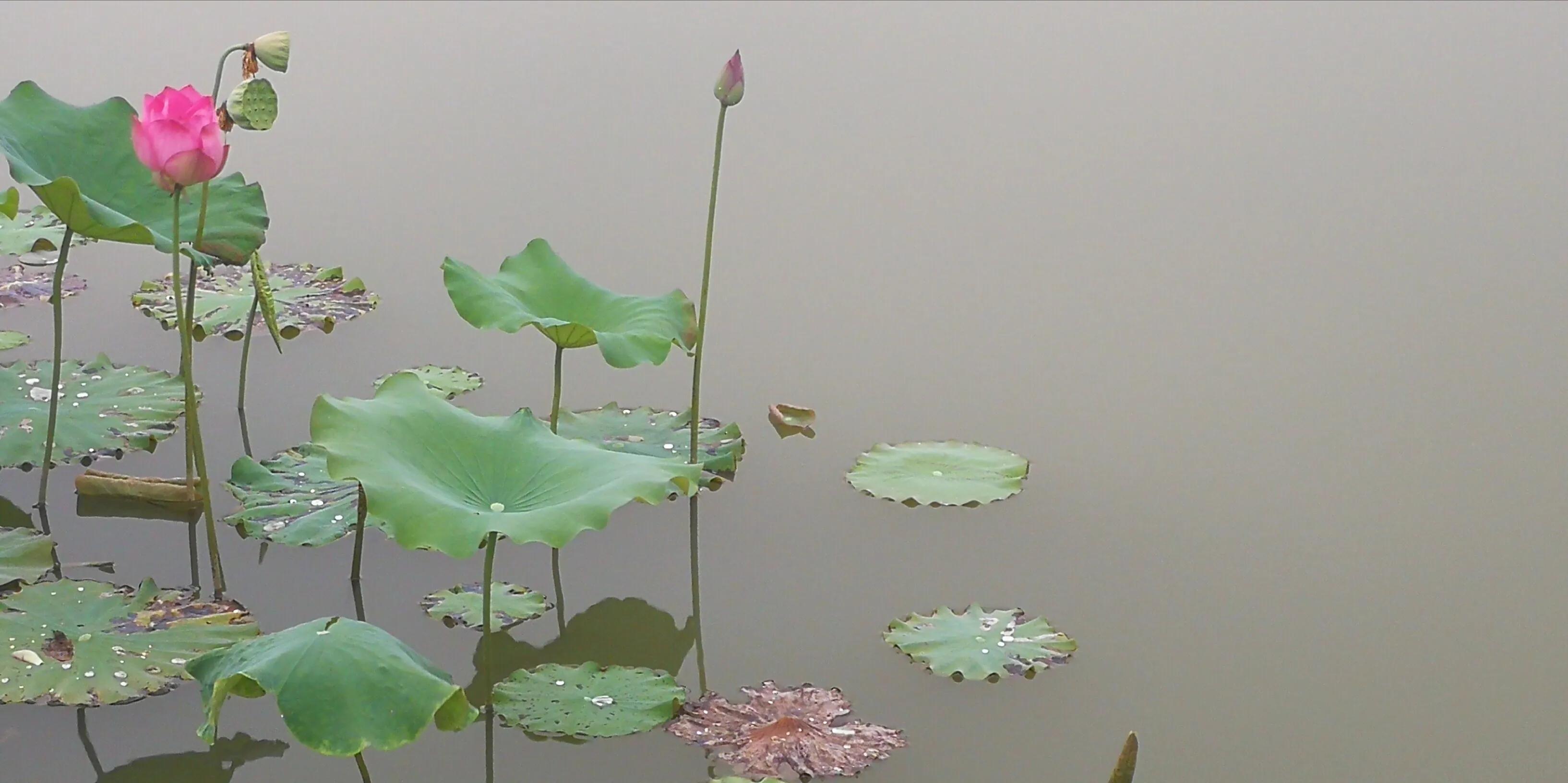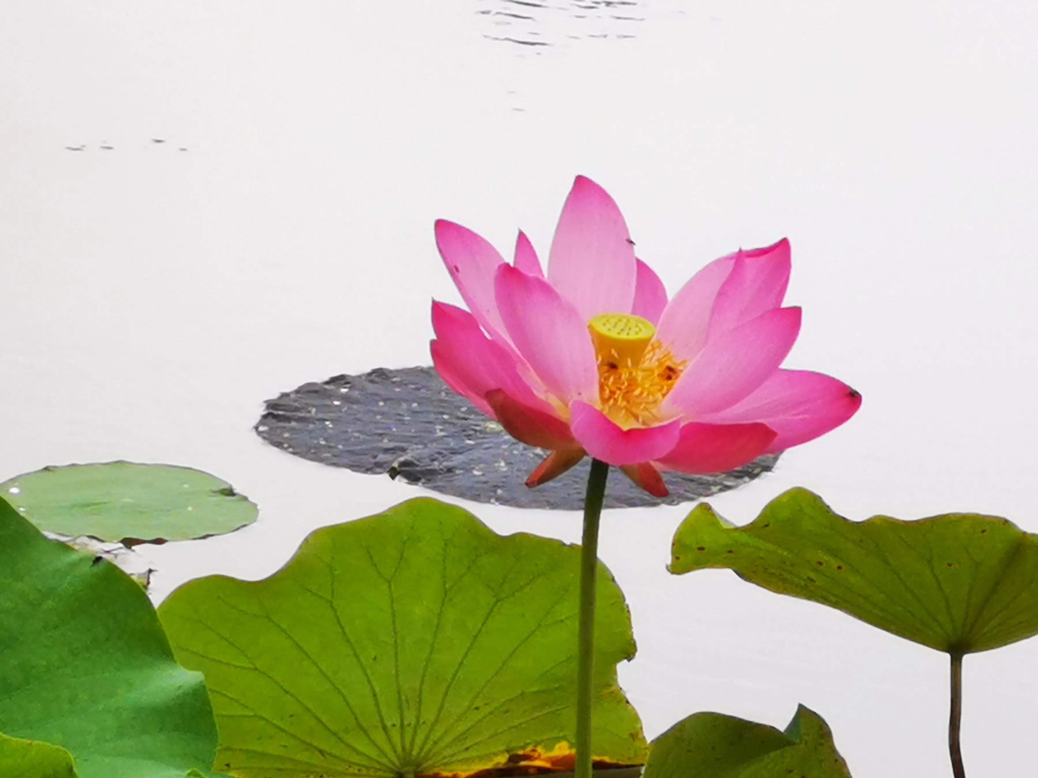 2.标题:一枝独秀引蜂舞,倒影荷叶水中现