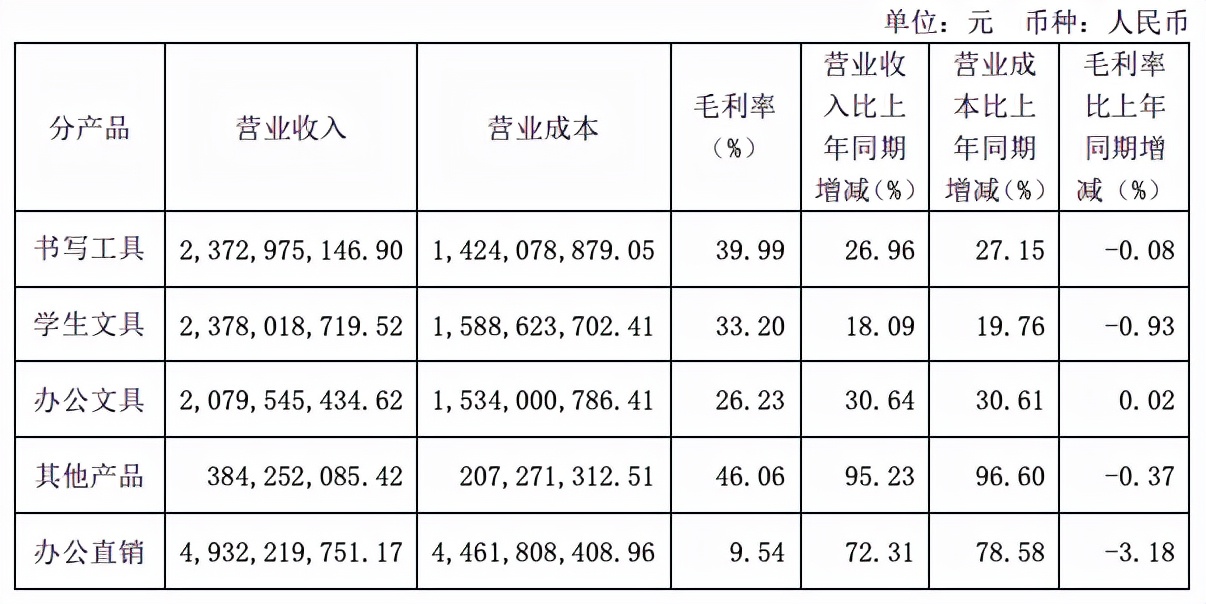“办公直销产品的营收占比达到了将近一半,毛利率却仅约为书写工具的五分之一,是典型的‘批发毛利’。一般来说,低毛利产品销售占比过高,公司就必然采取‘薄利多销’的营销模式,必须具有足够大的市场份额,大幅提升销量,以弥补毛利的下降。”零售和市场营销专家丁利国说。