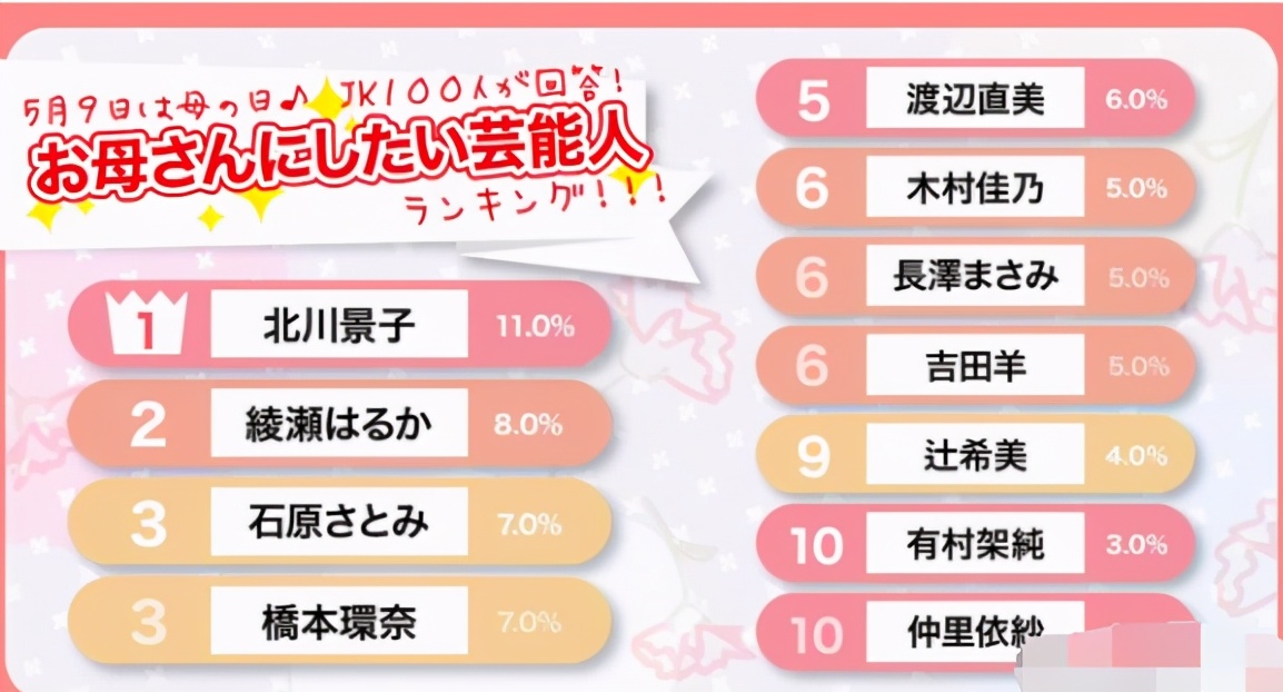 近日,日本以100名女高中生为对象,在“关于2021年母亲节的问卷调查”评选中,北川景子以最高票获得“希望做自己妈妈的女明星”第一名。大家选择北川景子的理由是因为“漂亮且看起来很温柔”、“生孩子后也很漂亮,自我克制的方面让人尊敬”、“有那么漂亮的妈妈会很开心”等。