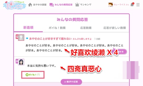 在提问后以绫濑的角度对自己的问题或其他人的问题进行回答。另外参加者还可以给自己认为最像是绫濑说的回答点赞,让ai不断成长。