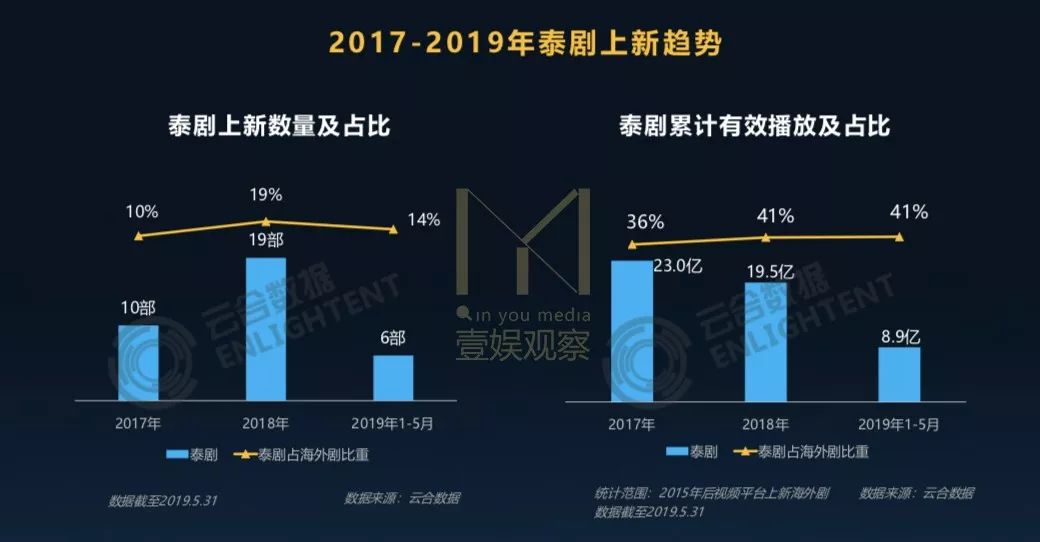 根据云合数据近日发布的《2017-2019年泰剧发展趋势分析》所示,2019年前5个月有6部泰剧在国内上线,收获了8.9亿的有效播放量。