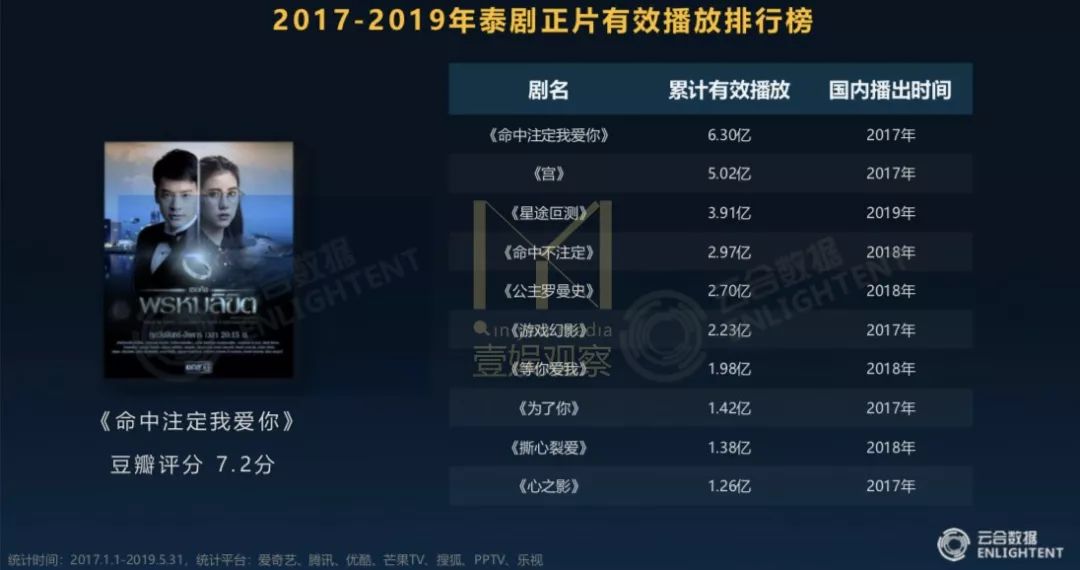 虽然从上述表单中可以发现,即使排名第一的《命中注定我爱你》的有效播放量只有6.3亿。但从《2017-2019年泰剧发展趋势分析》中受众反馈方面的数据看,2015年至2019年海外剧评论的前10名中,有《浪漫满屋》(泰版)和《宫》(泰版)2部泰剧入围;在海外剧弹幕量前10名的剧中,包括《星途叵测》和《命中不注定》在内的5部泰剧上榜。在海外版权剧市场中,泰剧粉丝的活跃度可见一斑。