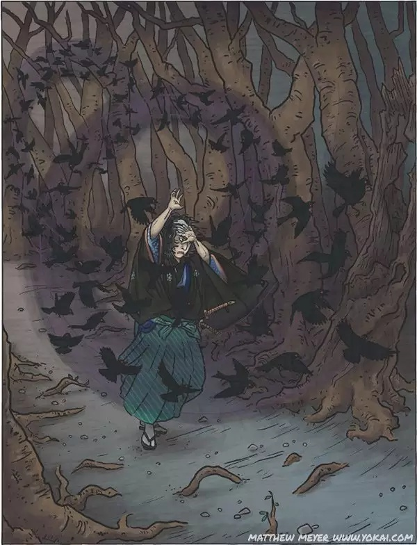 片中,久保造了一群麻雀,与一只真正的麻雀结伴而飞。在日本传说中,这有点像集结成群的「夜雀」,它们就像普通的麻雀,只是昼伏夜出(和蝙蝠差不多),经常出现在偏僻的山口和树林,成群集结,声音嘈杂。一旦飞入路人的袖口,那么此人必将面临不幸,所以人们在旅行至麻雀聚集地时,往往会紧闭袖口。