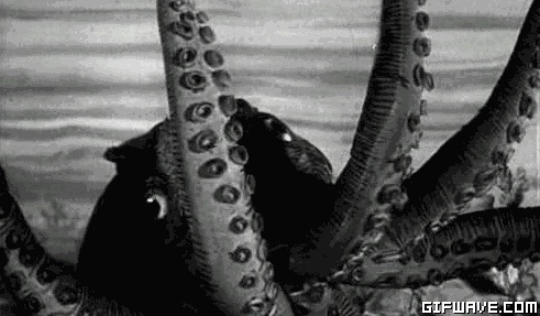 海底的章鱼怪,应该与日本传说无关,更多源于《异形奇花》(little shop of horrors,1986)中的食人花,以及雷·哈里豪森为电影《深海怪物》(it came from beneath the sea,1955)设计的大章鱼,似乎这两者结合起来才是怪物的灵感来源。