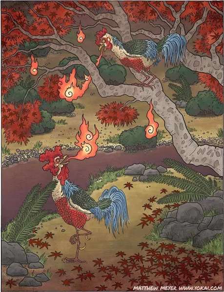 同样,久保还做了一只大黄鸡,这是妖怪「波山」。相传「波山」是一只会喷火的鸡,说是养了七年以上的鸡生出的蛋,孵出来就会变成「波山」。它会自己破壳而出,出生时像蛇,会钻入房屋地板下,在黑暗中成长,之后会变成鸡的模样,不过这个过程绝不会被人看到。长成鸡的样子后,便开始活动。会一点一点吸食熟睡人的血,最后把人害死。生出「波山」的母鸡会像公鸡一样打鸣,这时,就要立刻把鸡蛋烧掉,并把母鸡也杀掉。