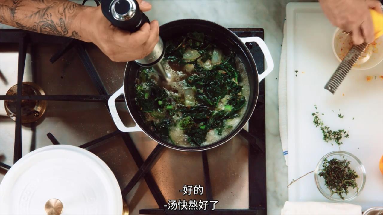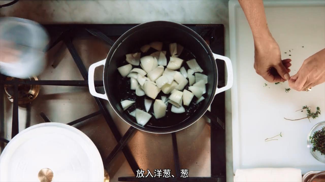 1、锅中放少许橄榄油,将切碎的苏格兰斯科奇博纳特辣椒、百里香、洋葱、葱、葱头、甘蓝、西蓝花放入锅中,加入适量蔬菜高汤炖煮;