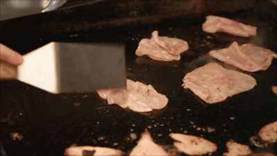2、将古巴酱烤猪、培根切片,放在铁板上煎至焦香;