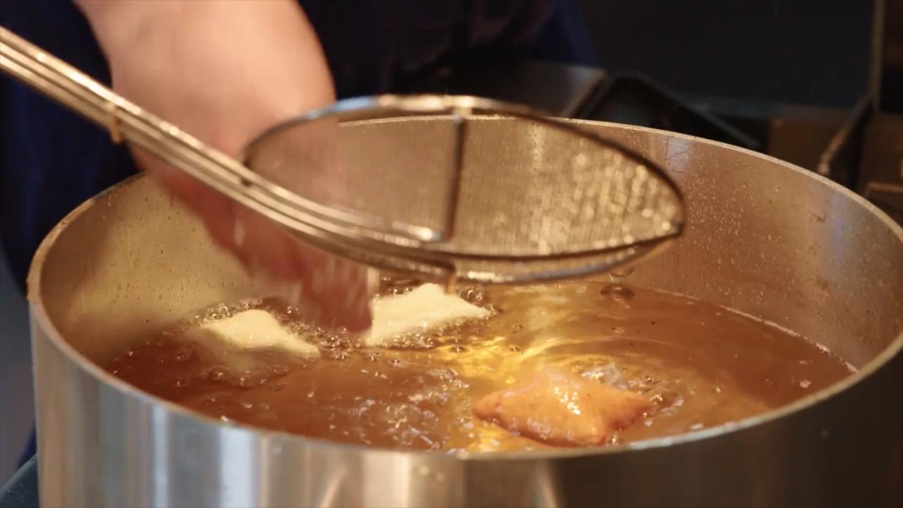 做饭:用水将面包粉搅拌均匀、擀制成面皮,将面皮切割成边长8厘米左右的正方形面块,放入油锅中炸制金黄酥脆,撒上糖分即可。