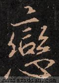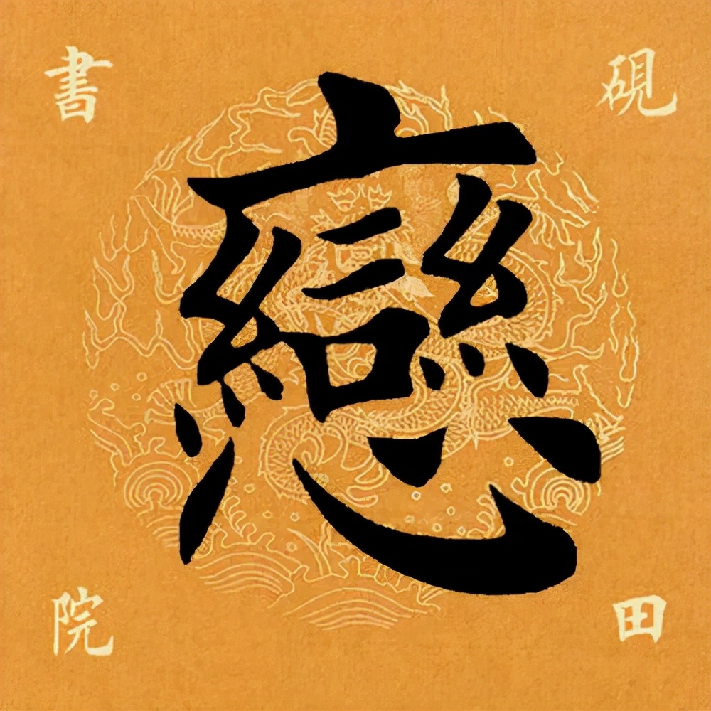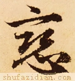 下部“心”旁要偏右:第一笔左点靠近上部左“糹”的中间小点起笔,左斜,勿重;心钩起笔要对准上部左“糹”的末点,露锋轻入,向右下弯行,渐渐加重,到位后转锋向左上方挑笔出锋;仰点在仰钩中心略偏左的位置,大小适中,挑笔出锋呼应下一笔;最后右点稍靠上,呼应仰点,稍长、厚重,以平衡整字。