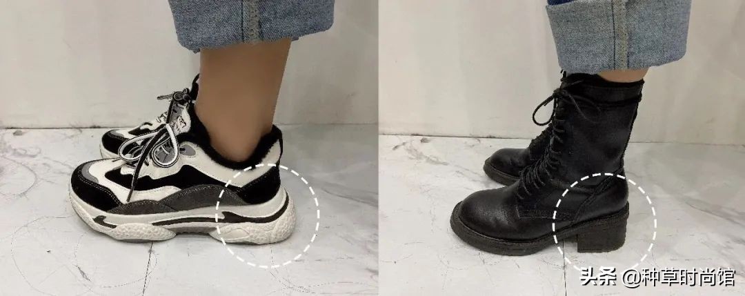 关键上脚特别协调,同样是外部增高5cm,老爹鞋看上去明显更自然。