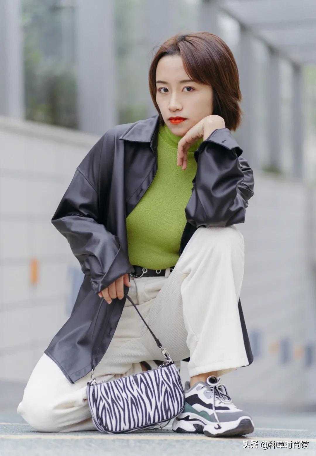如果外套与裤子是黑白色的组合,我会选一个亮色的内搭来丰富穿搭,这双黑白拼绿色的老爹鞋正好和打底衫的颜色起到了呼应作用。