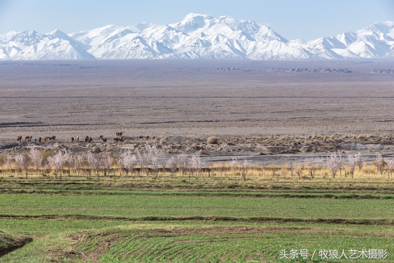 图5:2015年5月3日摄于甘肃玉门市昌马河村在河西走廊狭长的戈壁滩上流传着这样一句话:“哪里有树,那里就有人”,多少代生活在这里的人们,用自己勤劳的双手染绿了河西走廊,但在没有人生活的地方,由于严重缺少水源,依然是荒芜的戈壁滩,于是我们就看到了,雪山、戈壁滩、骆驼、杏花、麦地同出一副画面的境况。