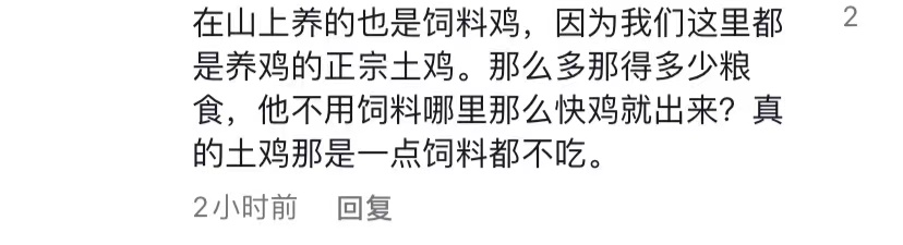 " 虽然赵亮在诸多场合都在尽力展现食材的天然优质。但在评论区依然遭到一些网友的质疑和吐槽。首先是食材问题,尽管赵亮多次强调自己养的鸡都是自然生长,但网友指出即便是在山上养的也是饲料鸡,否则不可能满足饭店的需求量。