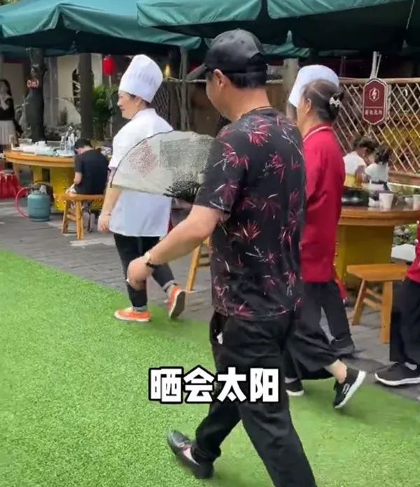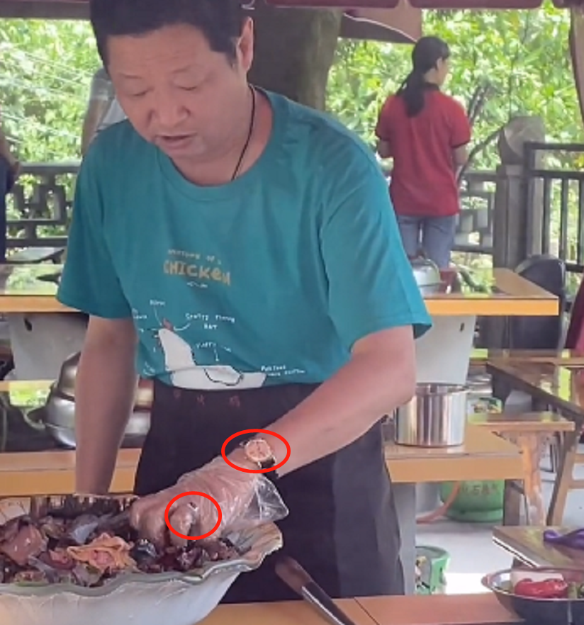 面对拍摄者的提问,赵亮开启广告模式,大赞自己的食材很好,一边大把向锅里放鸡肉,似乎在力证菜量够足。作为厨师,赵亮表现得很专业,手上戴着一次性手套。尽管戴着手套,还是能清楚看出他的金色腕表和大戒指,有了这两件穿搭物件,赵亮尽显老板的土豪气。