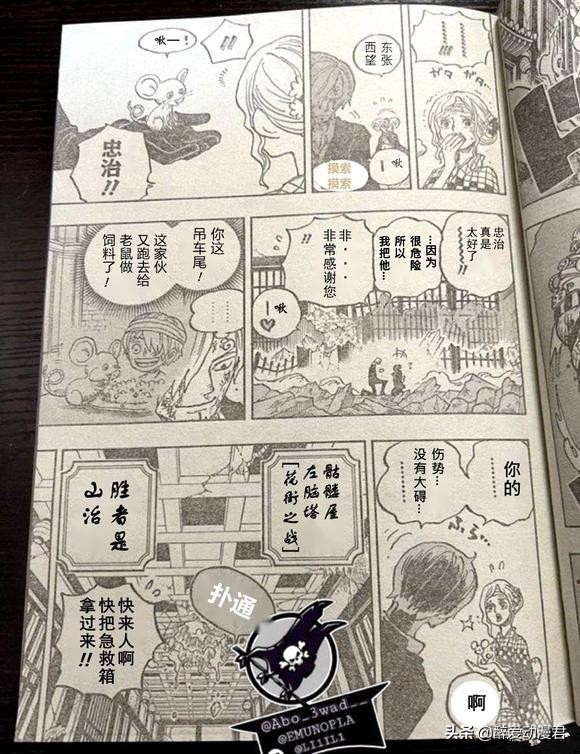 而山治在击败奎因之后,把小染的宠物给了她,之后就因为体力消耗过大,直接昏迷了过去。