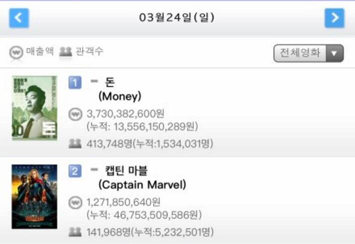 电影《钱》刚上映就登顶票房榜首,截止到3月24日,观影人次累计153.4万人次!日票房占比更是逐日增高,《惊奇队长》已然排在第二名。