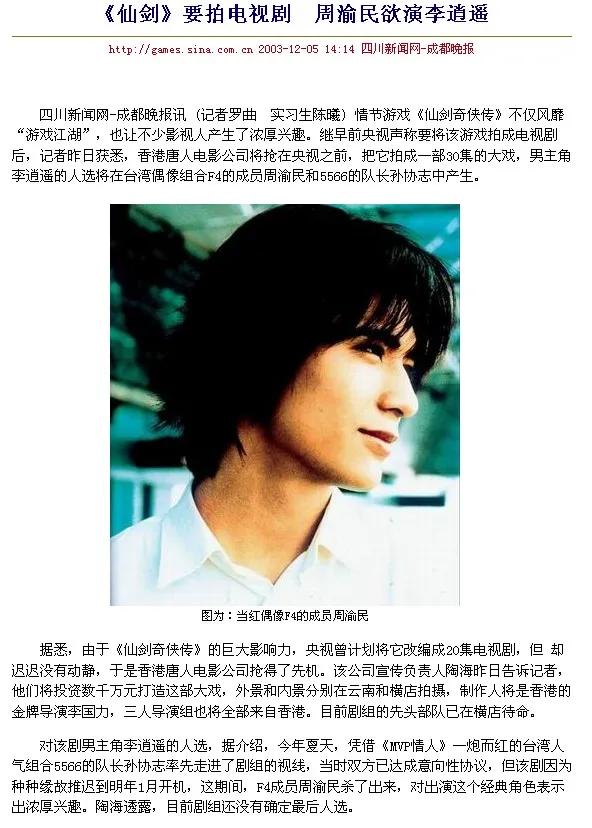 2004年,《仙剑奇侠传》准备开拍,男主角准备选一个名气比较大的,周渝民是候选人之一。