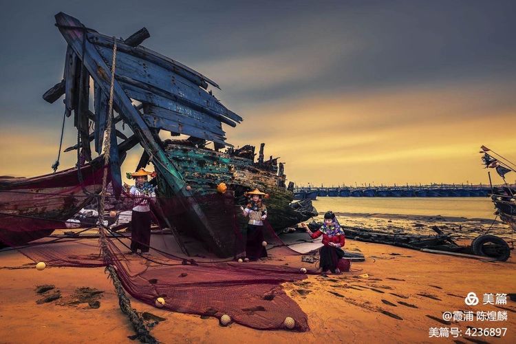 no5:早上四点二十出发小岞海边拍摄日出,渔灯火、惠安女抬渔船,织网劳作场景。