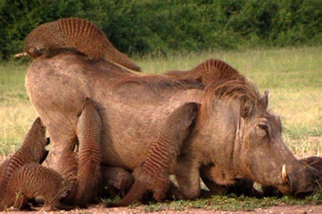 在非洲大草原上,疣猪和狐獴也是非常要好的朋友。疣猪的皮肤有很多皱褶,时间长了会生很多跳蚤、虱子,而狐獴又很喜欢这些脏兮兮的寄生虫。所以经常能看到一只懒洋洋的疣猪身上爬满了狐獴,疣猪享受狐獴帮自己清理着身体寄生虫,像是做了个“狐獴spa”。