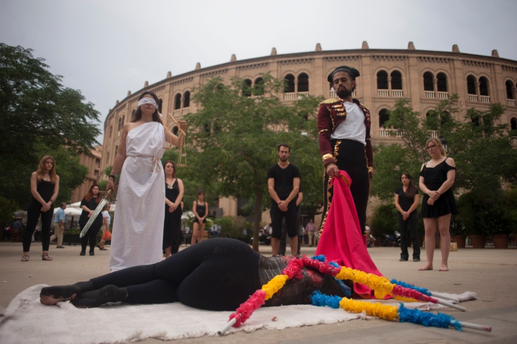 新华社照片,外代,2017年6月16日(外代二线)西班牙斗牛士6月15日,在西班牙格拉纳达斗牛场,动物保护者们在斗牛表演前在场外抗议。新华社/法新