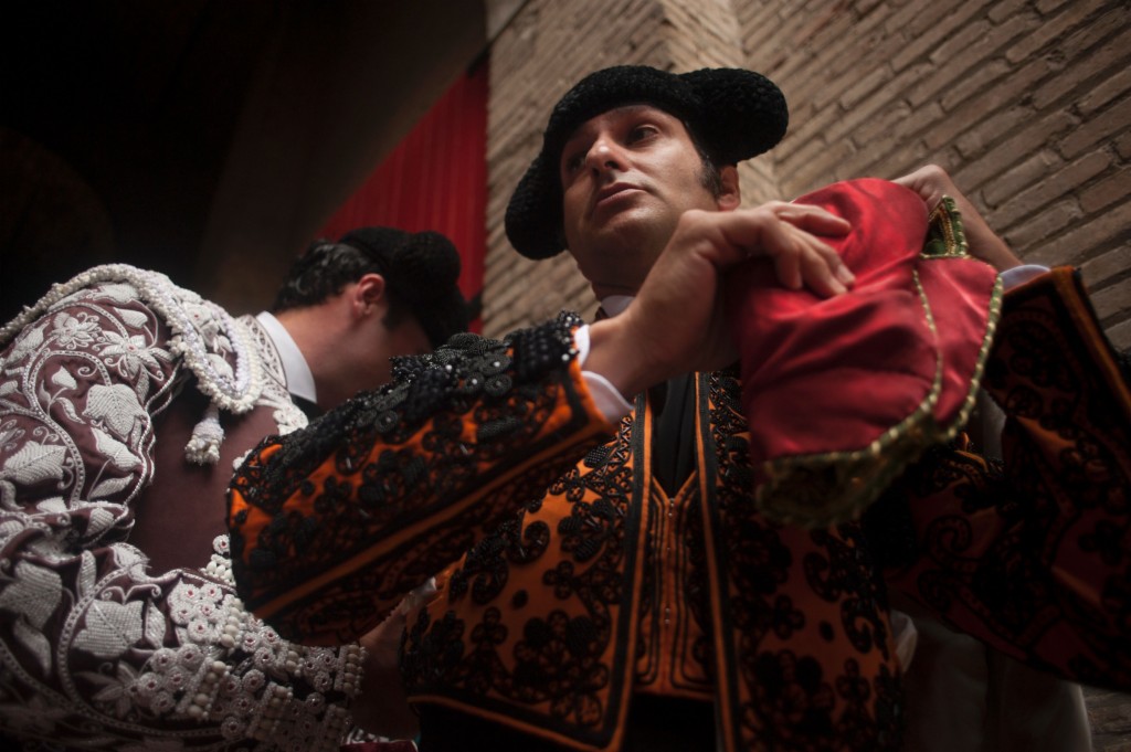 新华社照片,外代,2017年6月16日(外代二线)西班牙斗牛士6月15日,在西班牙格拉纳达斗牛场,西班牙斗牛士莫兰特·普埃布拉(右)准备上场表演。新华社/法新
