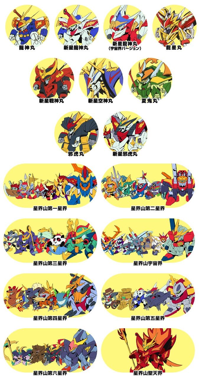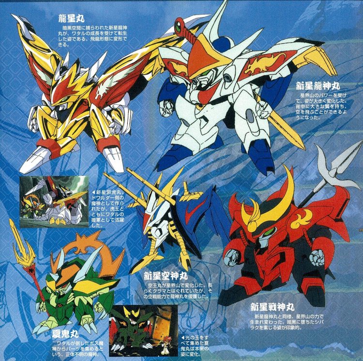 从右至左,从上而下分别是新星龙神丸、龙星丸(在辽译版中没有区分,都被称为“神龙斗士”)、新星战神丸、新星空神丸和凯比希驾驶的夏鬼丸