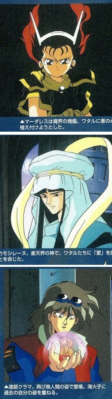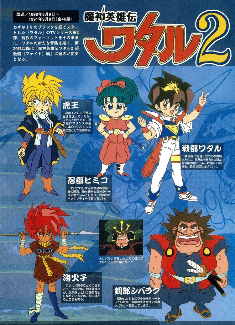 图为魔神英雄传2的主要角色,从上至下,从右至左分别是主角战部渡(瓦塔诺)、忍部火美子(西米格)、虎王、剑部武一郎(施巴拉古)和第二部加入的新角色海火子(凯比希)。