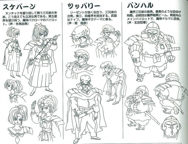 当时由于魔神2动画播放就在光能使者之后的一周,因此动画制作工期紧张,赶工严重,但一般动画里常有“明明分镜画好后要绘制原画了,人设还没定下来”的状况却极少出现,这是因为芦田大师能在构思情节或是初稿阶段就能提前两到三周把基本完成的设定图交付。这在业界是极为罕见的行为。“想让角色设定去影响剧本和分镜”。芦田认为只有这么做,才会做出能让剧本和演出完美结合的人物来。正是这样的敬业态度,他笔下无论是几位主角还是众多配角的人物性格刻画都特点鲜明,细致入微,一言一行都让人过目不忘,这也是魔神系列能如此成功的重要原因之一吧。