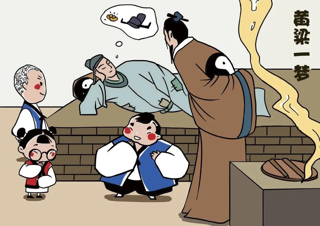 从前有个姓卢的读书人,整天都为得不到荣华富贵而苦恼。一次,他在去邯郸的旅店里,遇到了道士吕翁,就向吕翁诉说自己的贫困和苦恼。吕翁给他一个枕头,叫他睡觉。这时旅店的主人正在煮黄粱(小米)饭。读书人在枕头上睡着后,就做起了美梦,梦见自己封官拜相,娶妻生子,享尽了荣华富贵。可是一觉醒来,他看到一切依旧,连店主人的黄粱饭都还没煮熟。刚才自己所享受的一切,不过是人家煮黄粱时自己做的一个梦罢了。