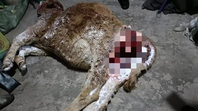 吉林珲春板石村九队西山附近,一头牛疑似被东北虎咬死,牛屁股被咬得血肉模糊,牛尸旁散落着疑似东北虎的脚印。