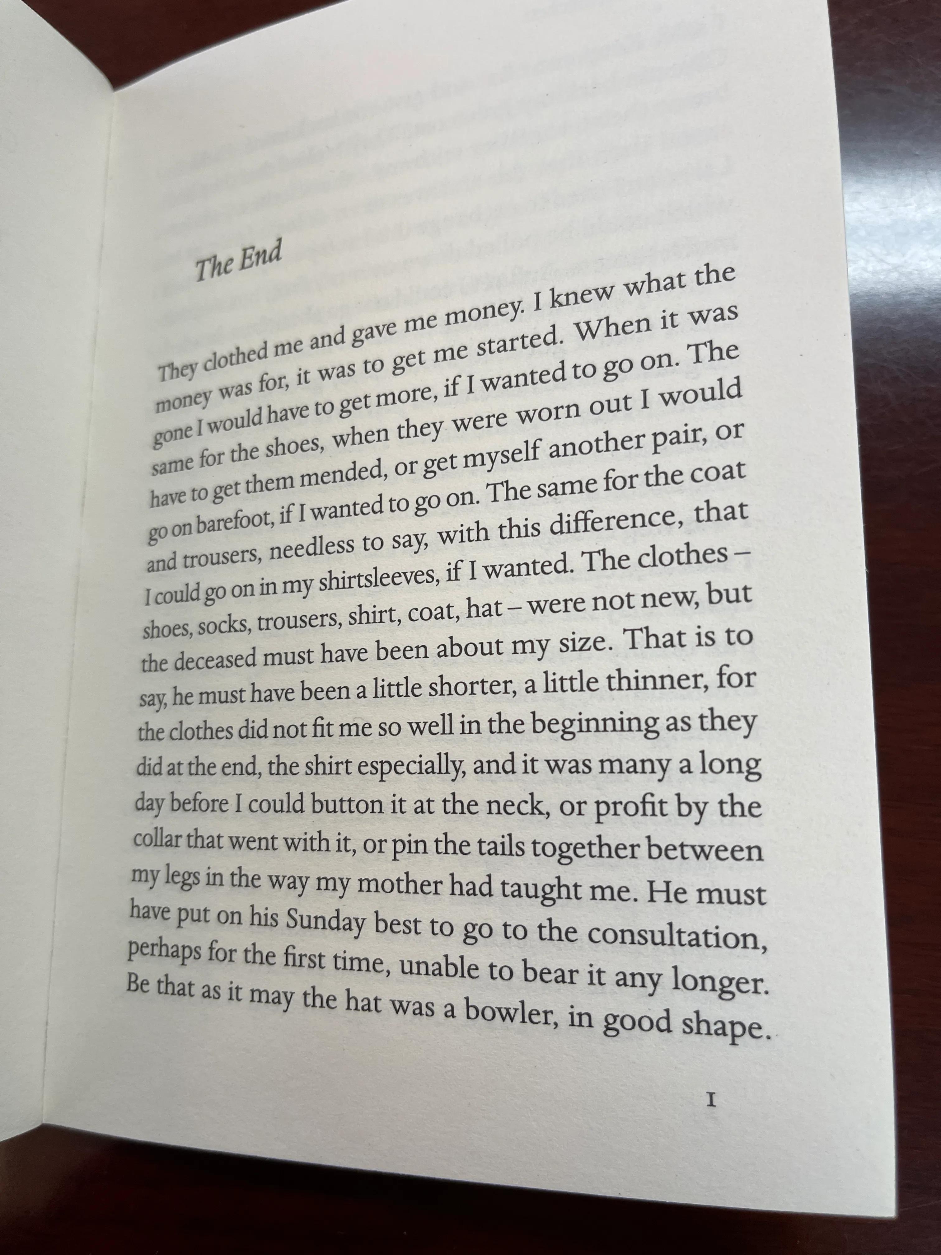 “他们给我衣服,给我钱。我知道钱是用来干什么的,是让我开始。当它消失后,如果我想继续下去,我就必须得到更多。鞋子也一样。要是穿坏了,我就得去补,或者再去买一双,要走的话,就光着脚走。上衣和裤子也一样,不用说,不同的是,如果我愿意,我可以只穿衬衫。衣服——鞋子,袜子,裤子,衬衫,外套,帽子——都不是新的,但死者的身材一定和我差不多。