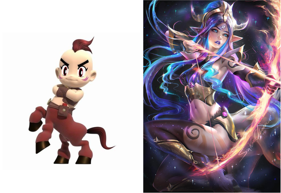 阿飞,第八季登场的半人马一族,特点就是下半身是马,而上半身是人,头发上有着马鬃一样的发型。往往射手座的人都很坦率,有一说一,绝不含糊和直觉性比较强。而射手拟人化后,紫蓝相间的发色和妖精般的脸型,给人一种这样一位弓箭手能百步穿杨的感觉,若隐若现的纱衣究竟是纱衣还是马的后半身呢?