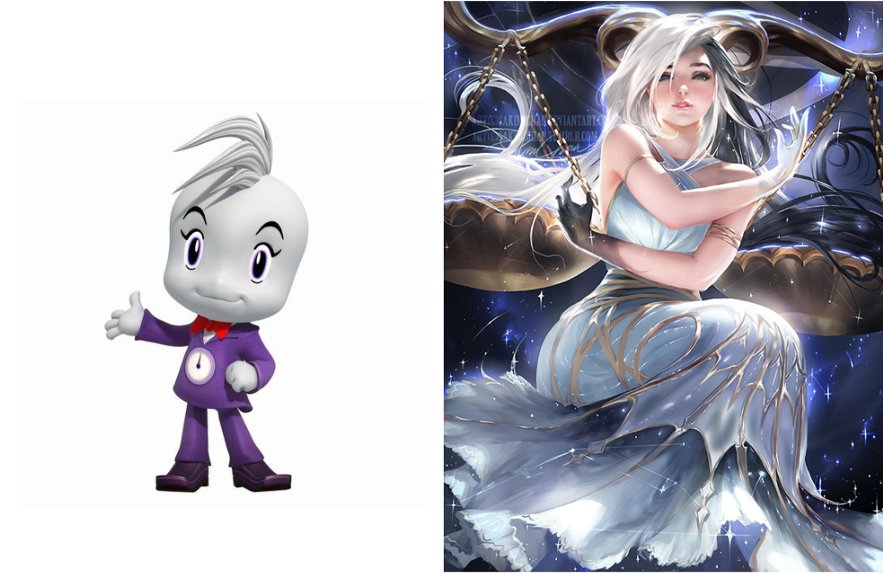 帅戈,在快乐星猫第六季才登场,特征是穿着一身绅士服装,别看他是个小孩模样,变身之后会是个爱耍酷的大帅哥。往往天秤座的人看待事物都非常客观,讲究公平,不会偏袒任何人。而天秤拟人化后,一半的发色是黑另一半即白,还有手套也是如此,这象征着对称、平等。