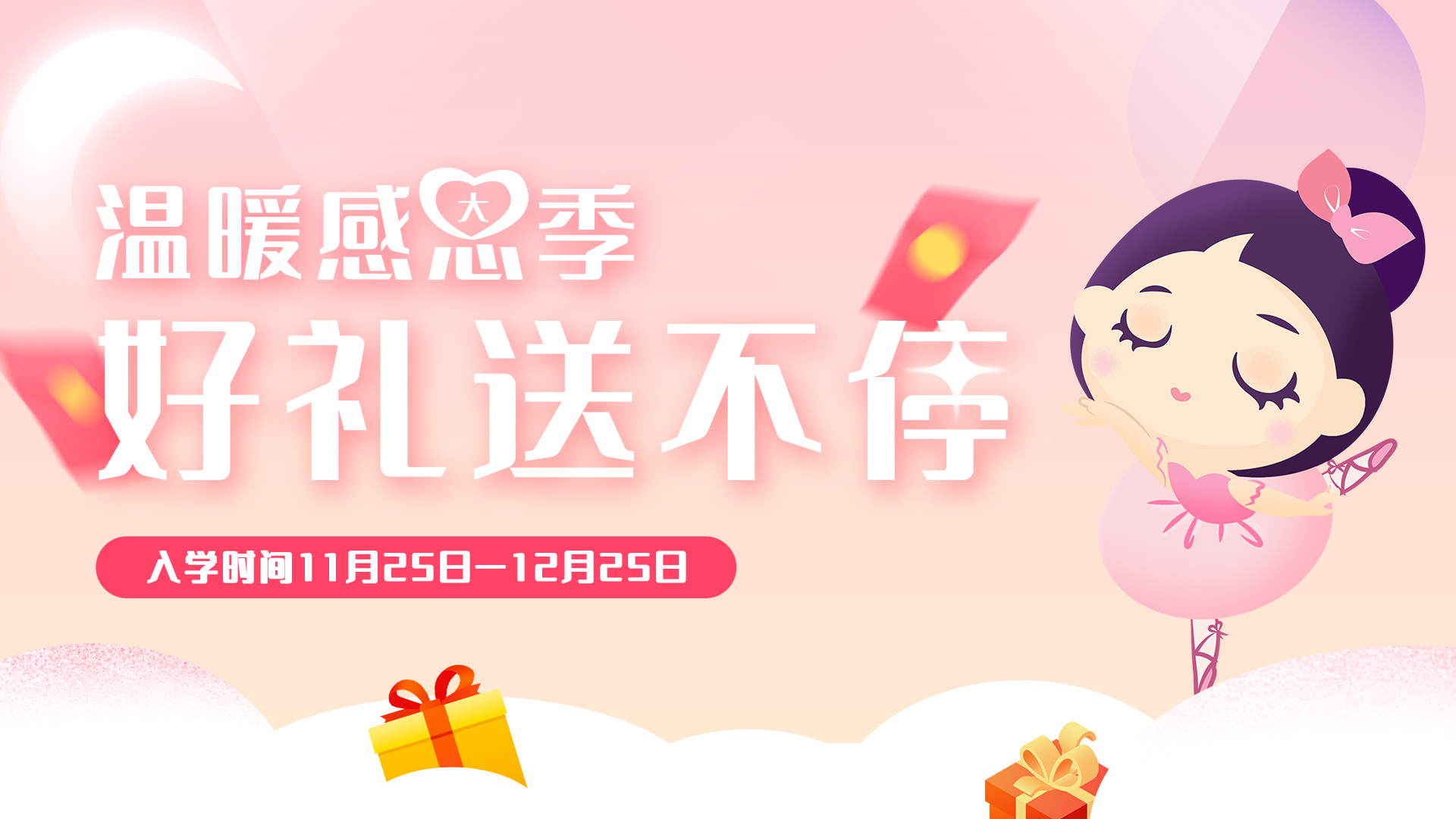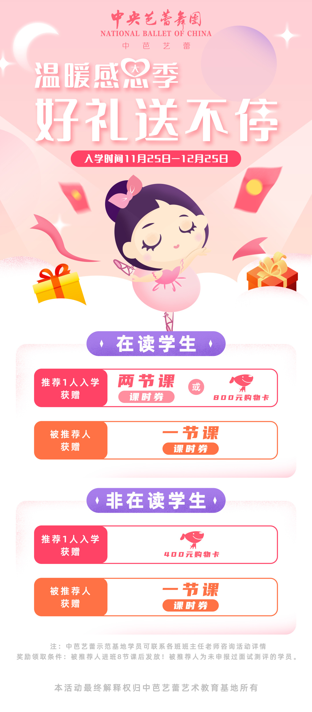 为了感谢新老学员将中芭艺蕾示范基地作为您芭蕾梦的起点,为了感谢各位家长对于中芭艺蕾示范基地教育工作的信任与支持,在这个寒冷的冬季,示范基地将赠与您最温暖的感恩之礼!在11月25日~12月25日期间,凡推荐一人入学,即可获得一份温暖的大礼!