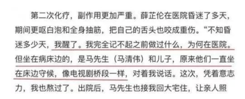 当薛芷伦打电话向前夫提出请求,想要在治疗期间搬回去跟前夫和孩子们同住时,或许是考虑到薛芷伦终究是自己3个孩子的母亲,也或许是难忘旧情,马清伟答应了。