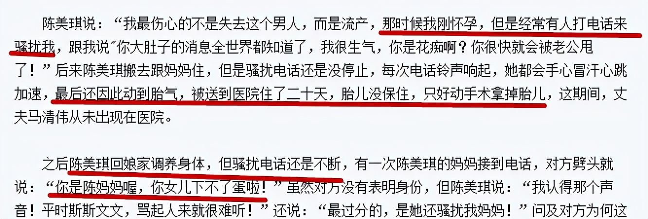 那时陈美琪已经怀孕,但第三者(有传是关之琳)常常打电话来骚扰她,甚至在她搬去和妈妈同住后对方都能查到电话继续打。发展到后来,陈美琪每次听到电话铃响,都会手心冒汗心跳加速。