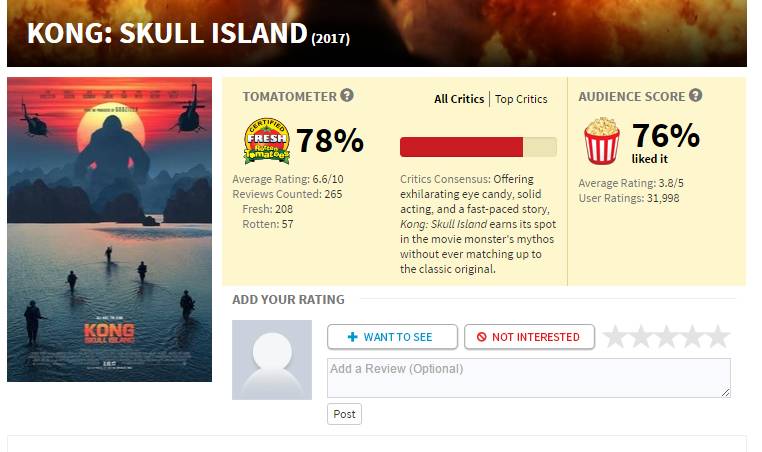 金刚也算是经典怪兽ip了,各种拍,而且越来越大,越来越牛逼。这一部,则是金刚大战其他怪兽的设定。北美的评价还好,烂番茄78%的媒体新鲜度,6.6分的评分。