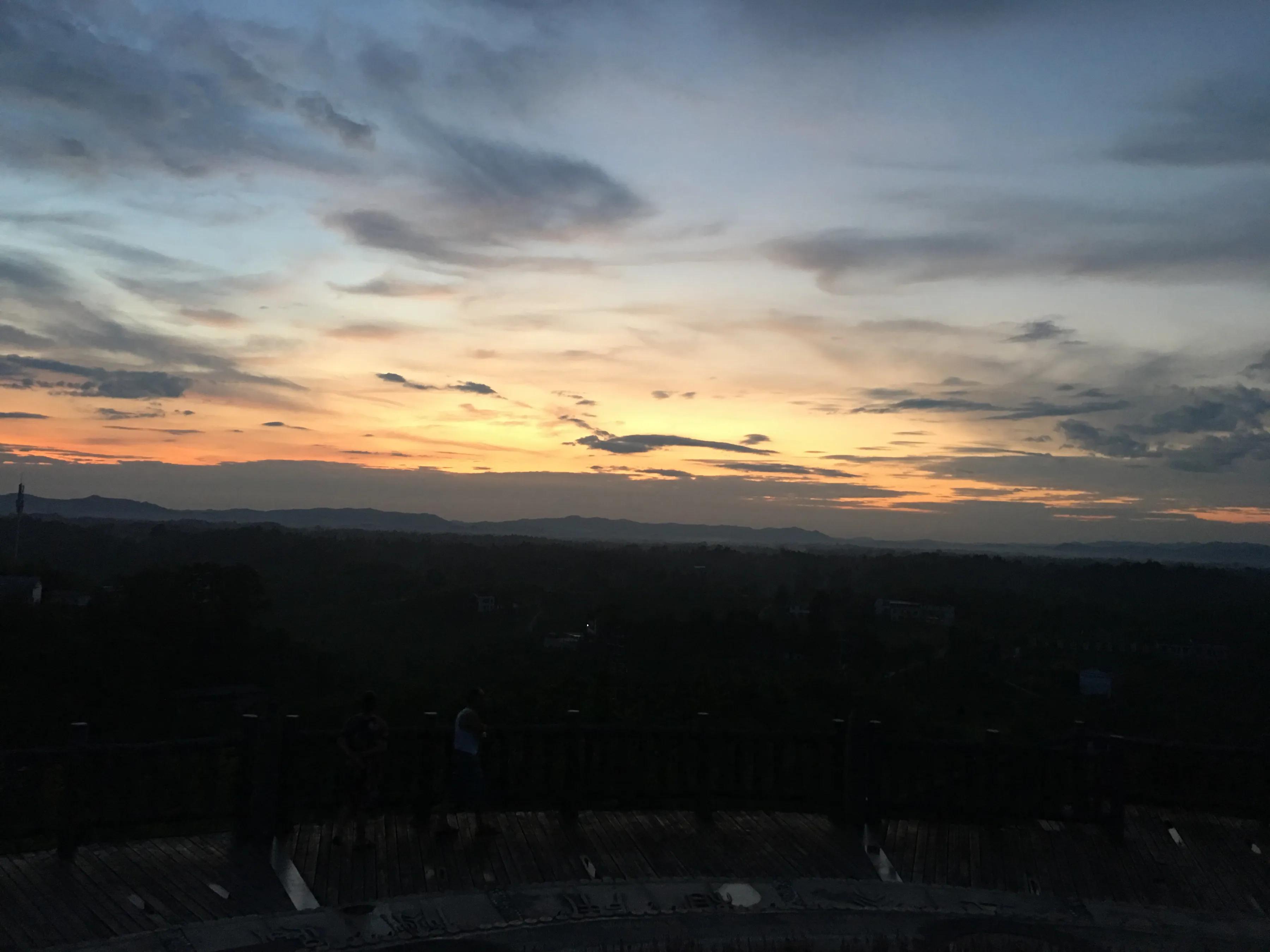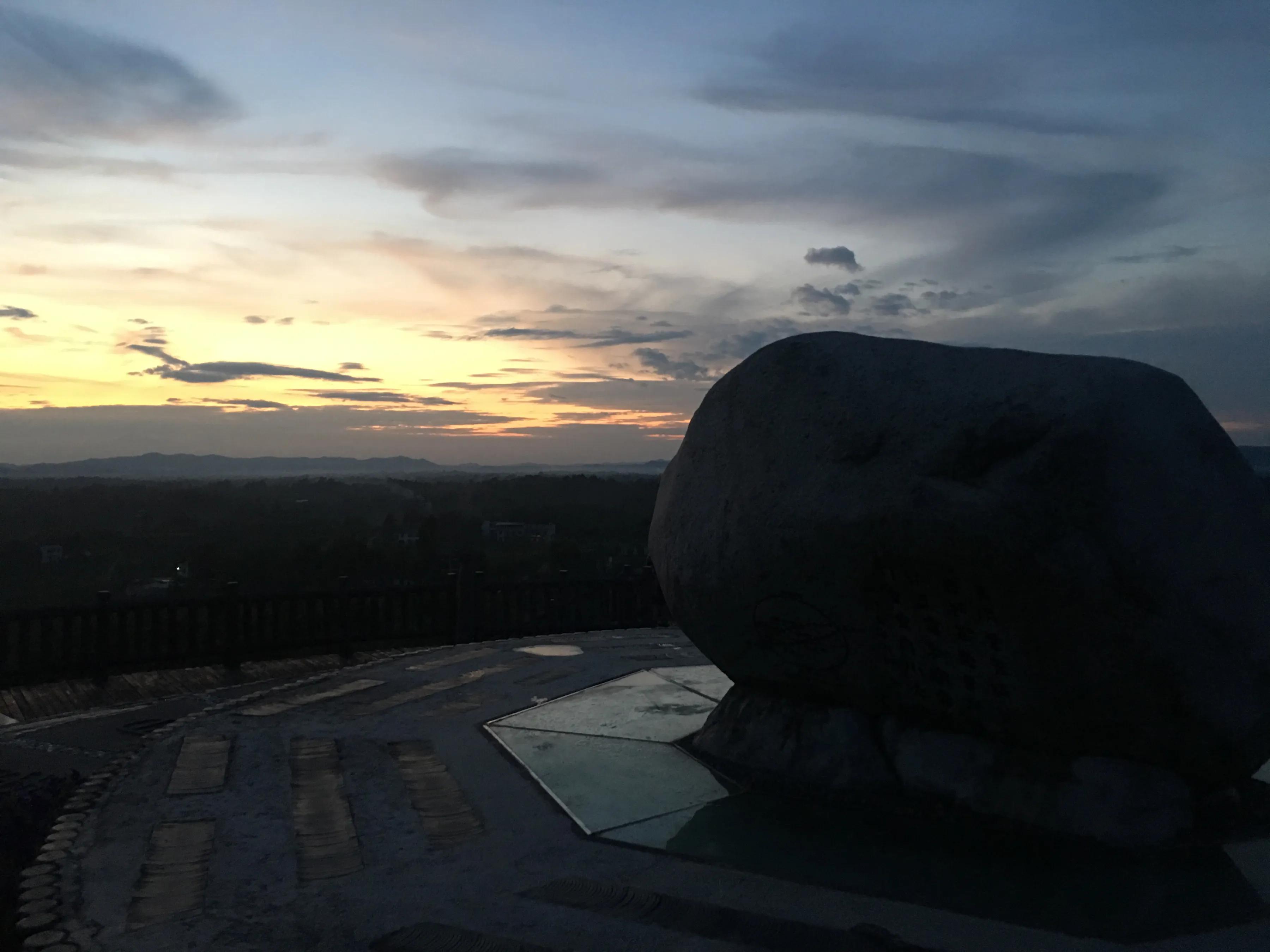 我在日晷图四周走走看看,一抬头,天上的锦绣已变成青色布缎,最远处,升起的袅袅白雾像是画了一个圆圈。这天地,仿佛荡起了一层层涟漪,我们正在涟漪之中。我手扶栏杆,看山下的农作物被夜色一点点的包裹着,偶尔从农家里冒出一星灯火,蟋蟀、知了、青蛙也在这时雀跃起来了,尽情的演唱,似要获得晚风的称赞。