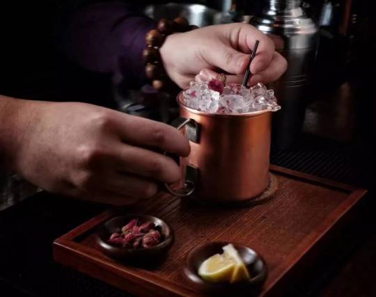 他特意给我调了一杯“养生酒”(酒单上都还没有哦),名字起得很有古意,叫“忘尘”。这款酒虽然是以白酒作为基酒,但是我喝起来感觉酒味并不是很重,反而有一种清爽的甜,洋洋解释道是加入了甘草、洛神花以及牛奶的缘故。