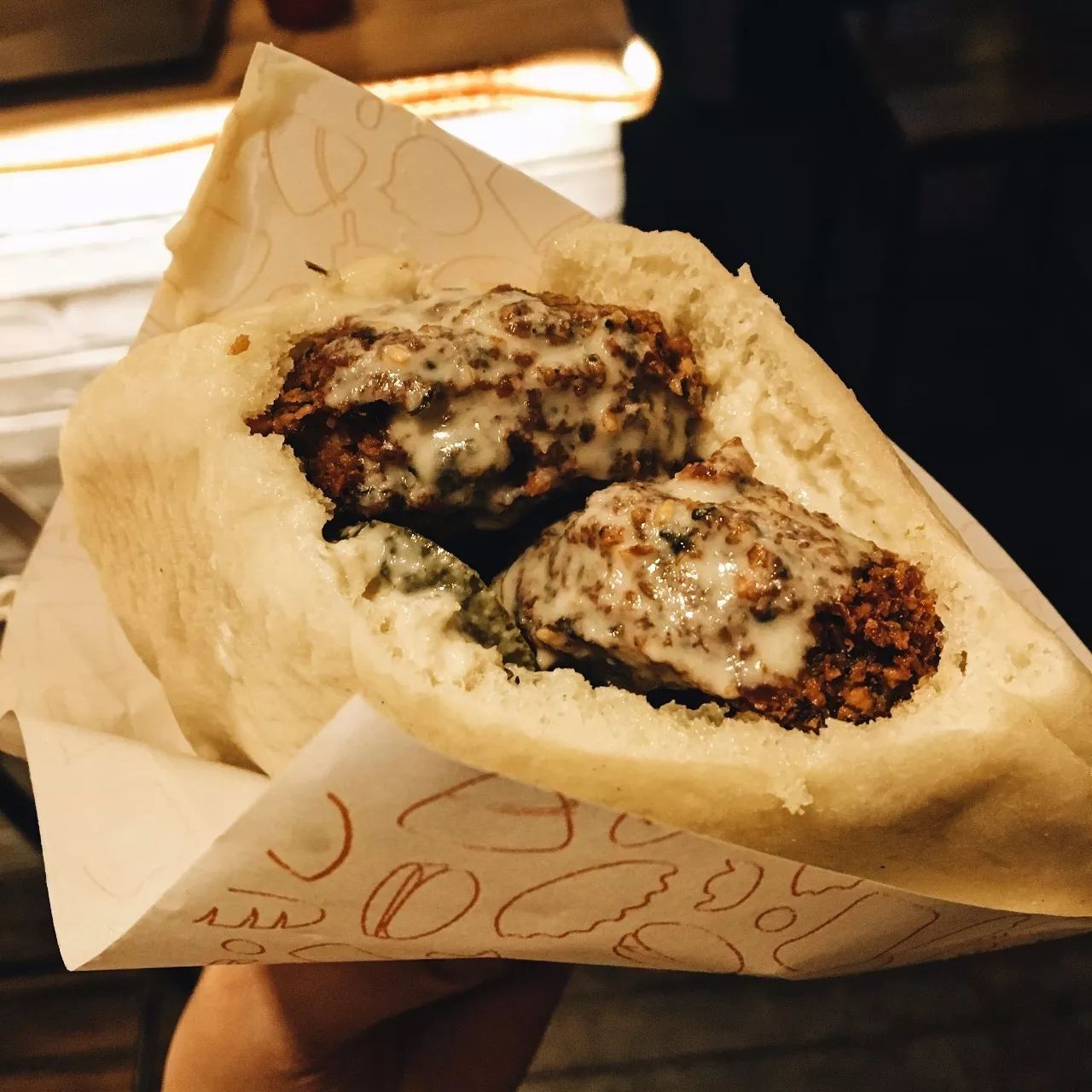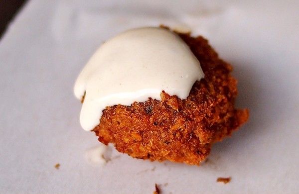 这个名词一出来我又是一脸懵,好在老板继续科普:这是一种用磨碎的鹰嘴豆与特制酱料炸成的松脆食品,把法拉费和蔬菜加入披塔,再撒上中东特色的白芝麻酱,经典的法拉费披塔就成了。说完,立马钻进后厨忙活去了。