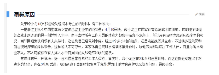 一种是释小龙的助理出于好奇从3米跳板跳了下去,但不幸发生了意外。
