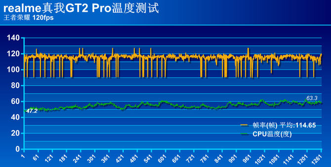 得益于良好的散热设计,在《王者荣耀》120帧模式下,realme真我gt2 pro的温度控制也是非常出色,在室温20度的环境下,测试20分钟,最高温度63.3度,游戏并没有因为温度提升而出现严重的掉帧现象。