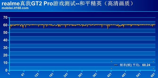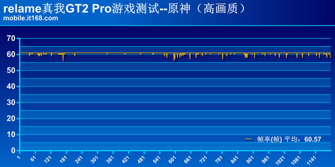 游戏测试可以看到,真我gt2 pro支持《王者荣耀》120帧模式,《王者荣耀》测试的可以长时间保持在120帧附近,平均帧数114.56帧,游戏运行非常流畅。在《和平精英》高清画质设置下,游戏平均帧数为60.24帧,游戏可以长时间保持在60帧。在《原神》这个高要求的游戏测试中,高画质下真我gt2 pro能有60.57帧的平均帧数,游戏的运行也是相当流畅。