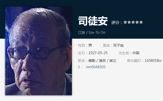 司徒安原名曾坤,生于1927年的广州,之后移居香港以笔名“江游”撰写剧本,1954年上映的粤语片《人结人缘》是司徒安第一个拍成电影的剧本。此后撰写过《如来神掌》《黄飞鸿》系列电影剧本,一跃成为港圈最红的编剧。
