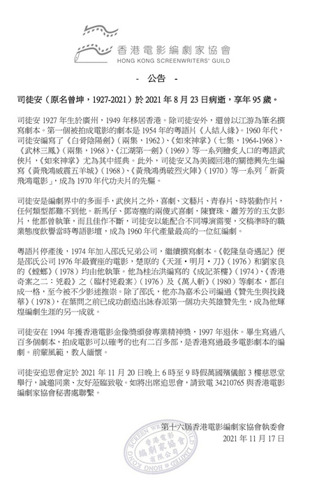 香港电影编剧家协会发布讣告透露,将于11月20日晚在殡仪馆为司徒安举行追思会,诚邀同业、友好位临致敬。