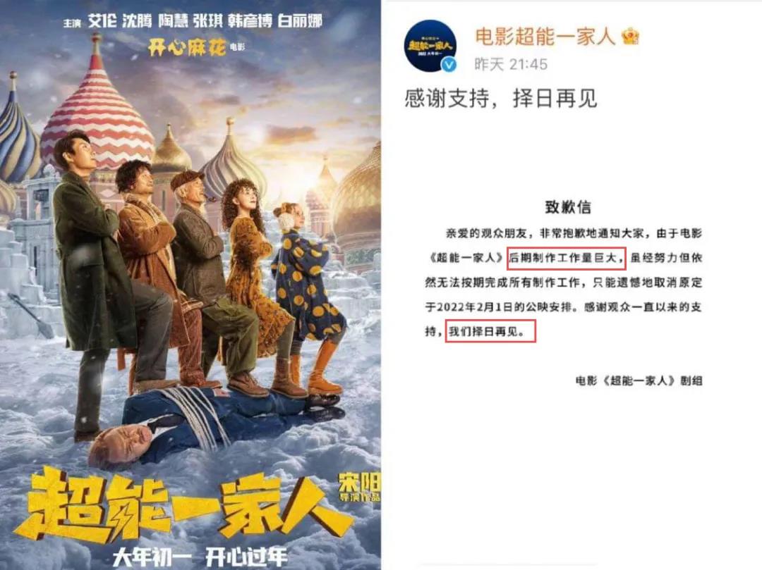 最近,沈腾原本预计在春节档上映的电影《超能一家人》宣布退档。
