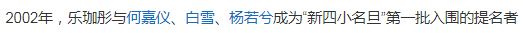 2002年,乐珈彤还曾与何嘉仪、白雪、杨若兮一同被列为“新四小名旦”。