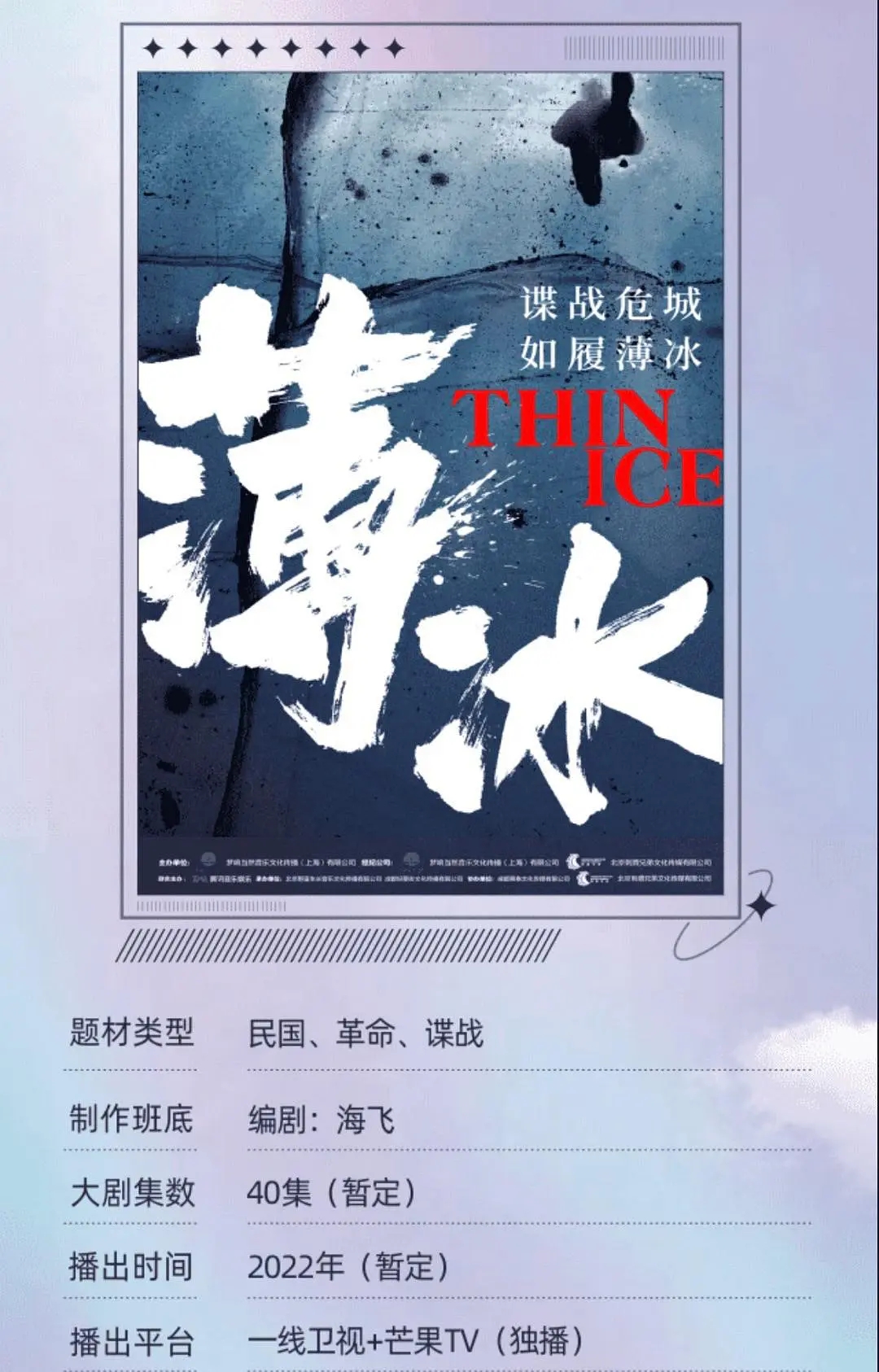 虽然《薄冰》尚未官宣演员阵容,不过以金牌编剧海飞出马必属精品。而该剧也是芒果tv年度巨制,将作为重点剧目于2022年巨献。《薄冰》讲述男主陈浅原是军统特工,因被共产党员相救,最终坚定了自己的共产主义之路。他潜伏敌营,为抗战胜利作出了重大贡献。