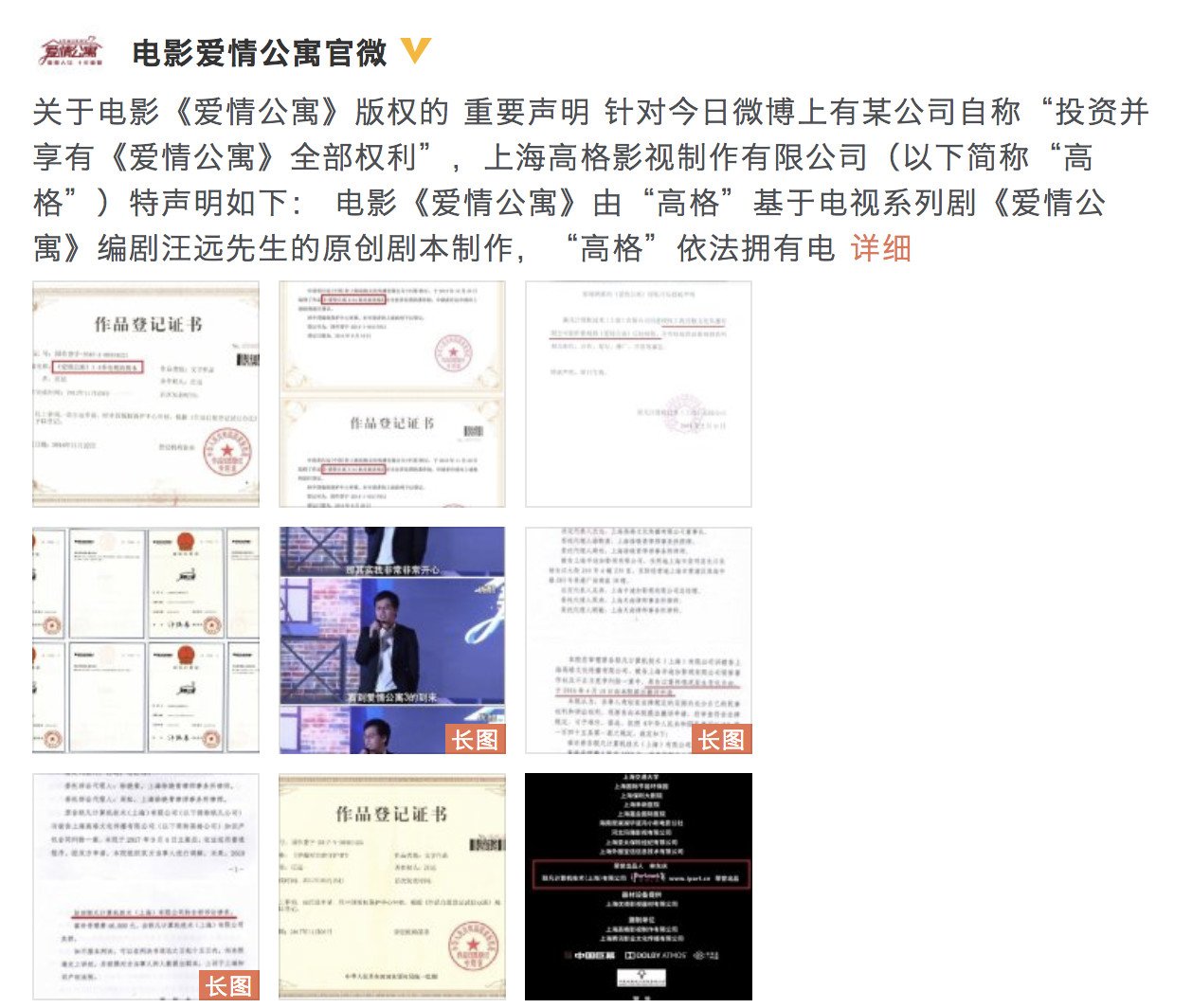 随后电影《爱情公寓》官微也发出了声明,声明称:“电影《爱情公寓》由上海高格影视制作有限公司(以下简称‘高格’)基于电视系列剧《爱情公寓》编剧汪远先生的原创剧本制作,‘高格’依法拥有电影《爱情公寓》完整著作权,并已事先获得了一切必需的法律授权与许可。对于就《爱情公寓》著作权及知识产权进行恶意诽谤和骚扰的行为,‘高格’保留对其进行诉讼乃至追责的权利。”同时微博中还晒出了多张作品登记书及商标注册证,在一份今年6月29日宣判的民事判决书中显示,联凡于去年9月就一起知识产权合同纠纷案起诉高格, 最终上海徐汇区人民法院驳回了联凡的全部诉讼请求。