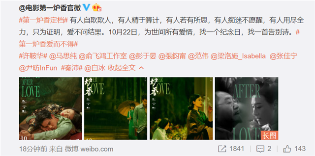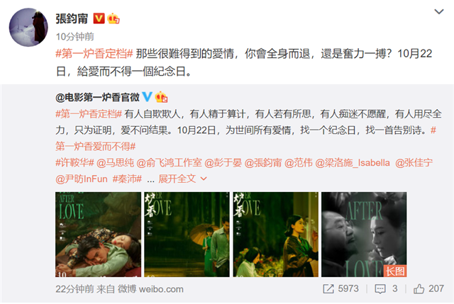 9月22日,电影《第一炉香》发布动态宣布定档,时间为10月22日,官微还依次艾特了电影主演的明星们,艾特了张钧甯一起宣传。这也意味着张钧甯并没有受到此前风波的影响,工作依旧照常进行。